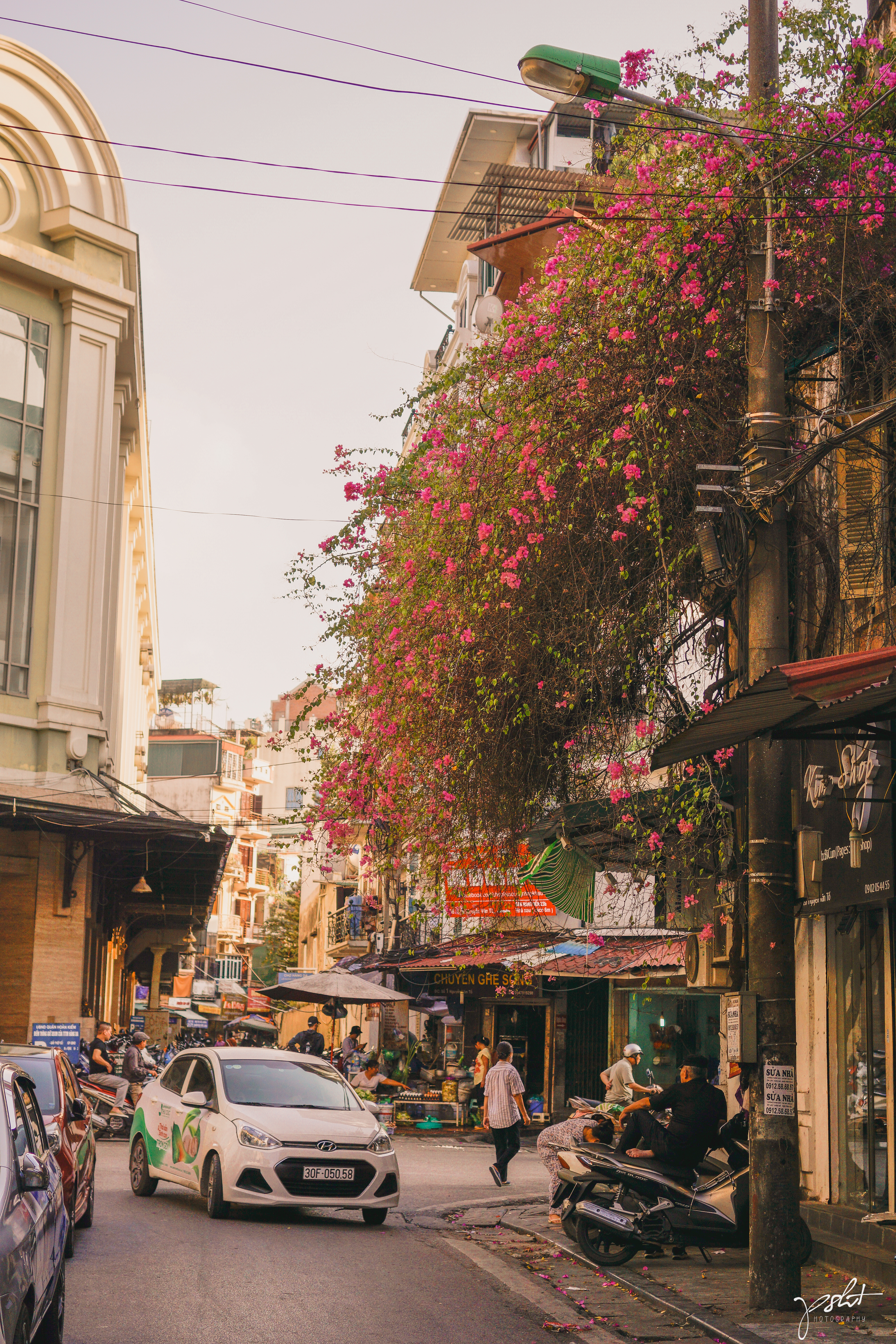 Hôm nay tớ đã xách máy ảnh lên đi chụp streetlife sau bao sự lầy lội và mất cảm xúc. Lần này thì tớ không đi những tuyến phố quen, đông người mà bước dọc những con phố buôn bán sầm uất. Và lúc ấy tớ nhận ra, tớ không thích cảnh kẻ buôn người bán chút nào. Đầy những to tiếng, cãi lộn, phức tạp. Và cứ thế, tớ bước đi không mục đích, từ Ngõ Trạm ra Nguyễn Quang Bích. Trời ơi phố Nguyễn Quang Bích phải nói thật là nó như một Hà Nội xưa thu nhỏ vậy. Con phố êm đềm, với dàn hoa giấy hồng rực rủ xuống sáng bừng một góc phố. Không tiếng còi xe, không tiếng cãi lộn, chỉ có tiếng gọi nhau thân thương của mấy hộ gia đình trong phố nhỏ, chỉ có tiếng mài dao xoẹt xoẹt từ tốn mang đầy hơi thở cuộc sống. Giờ tớ mới nhận ra là cứ ở đâu có Tranquil, ở đấy thật bình yên. Lần này tớ đi chụp nên không có thời gian nấn ná lâu ở con phố nhỏ ấy, nhưng nhất định sẽ có một ngày, tớ sẽ trốn cái cuộc sống hiện tại này để ích kỉ một chút, tận hưởng một kì nghỉ ở my oasis ấy.