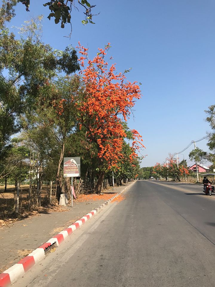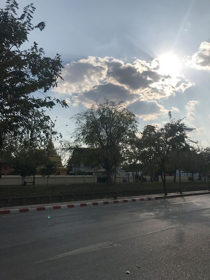 Quãng đường xa và nắng nhưng không hề khiến chúng tôi mệt mỏi, bởi vì cảnh vật ở Chiang Mai quá ư là đẹp. Không những vậy, giao thông ở đây cực kì quy củ và văn minh. Những người lái ô tô (lái từ trong ngõ hoặc đường-cắt-ngang ra) nhường đường cho chúng tôi từ khi chúng tôi còn cách họ rất rất xa (khoảng 10m lận). Đường rộng rãi, bằng phẳng, dù xe cộ đi lại nhanh nhưng vẫn cảm thấy rất an toàn vì người ta không có ấn còi inh ỏi chút nào luôn ý. Thề là cả quãng đường 4km không một tiếng còi luôn. Xe trước dừng cách xe sau hơn nửa mét, vô cùng kiên nhẫn, không hề lấn làn hay gì hết huhu.