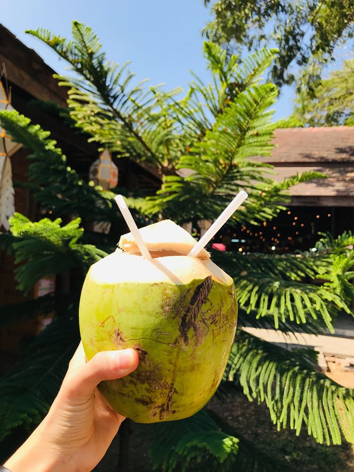 Đi dạo một vòng chợ, chúng tôi thấy deal hời nhất mà mình chốt được chính là quả dừa mát rượi tâm hồn này. Chỉ có 25baht (~18k VNĐ) cho một trái dừa siêu nhiều nước uống mãi không hết, uống đến đâu là cảm giác mát đến đó luôn :>. Và cùi dừa thì non mềm nên chúng tôi quyết định mang về nhà rỉa sau.