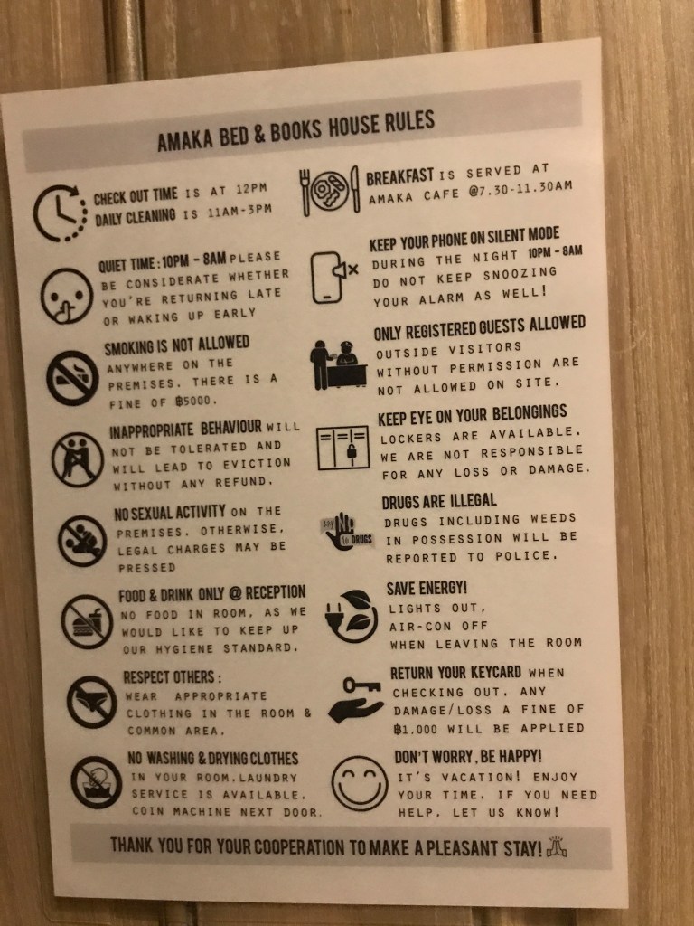 Đối diện giường Mei là một chị người Trung Quốc. Thật sự sang Chiang Mai, chúng tôi thi thoảng đeo khẩu trang thôi vì không hít một hơi thật căng lồng ngực không khí ở Chiang Mai thì thật là có lỗi với hai cặp phổi. À kể tiếp chị người Trung Quốc. Chị có một tâm tính siêu nice được giấu bên trong một vẻ ngoài người Tàu. Chị bảo chúng tôi là, ‘chúng mày nên đi bộ để tận hưởng Chiang Mai, chứ thuê xe làm gì’ (khi chúng tôi hỏi tất cả mng chỗ để thuê xe). Nhưng vì muốn đi Đông, Tây, Nam, Bắc trong một ngày, nên chúng tôi phải thuê xe đạp bằng được. Đang hỏi han chị Tàu ăn chơi ở đâu thì chúng tôi thấy một bóng dáng trăng trắng tồng ngồng chạy qua sau lưng. Chưa kịp chuẩn bị tinh thần, đập vào mắt chúng tôi là cha nội Đức mặc mỗi chiếc sịp màu xám chạy vội vào nhà vệ sinh :> Okay, chúng tao cũng biết là ngủ naked tốt cho sức khoẻ, và giải quyết nhu cầu kịp thời cũng tốt, too, nhưng hãy nghĩ cho hai đứa con gái châu Á sống trong nền văn minh nghìn năm kín cổng cao tường, dù trên giấy tờ là 20+ nhưng tâm hồn vẫn là mảnh trong sáng 18-.
