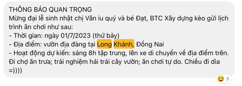 Đó là một chuyến đi vui và ý nghĩa nhất trong năm 2023 của mình, dù cái nơi mình đến không phải danh lam thắng cảnh gì. Mình rất biết ơn anh chị đã tổ chức buổi miệt vườn trong ngày ấy, ngày hôm đó mình được sống từng giây từng phút mà không phải lo lắng chuyện nhà cửa, là ngày duy nhất mình vui vẻ lạc quan như vậy.