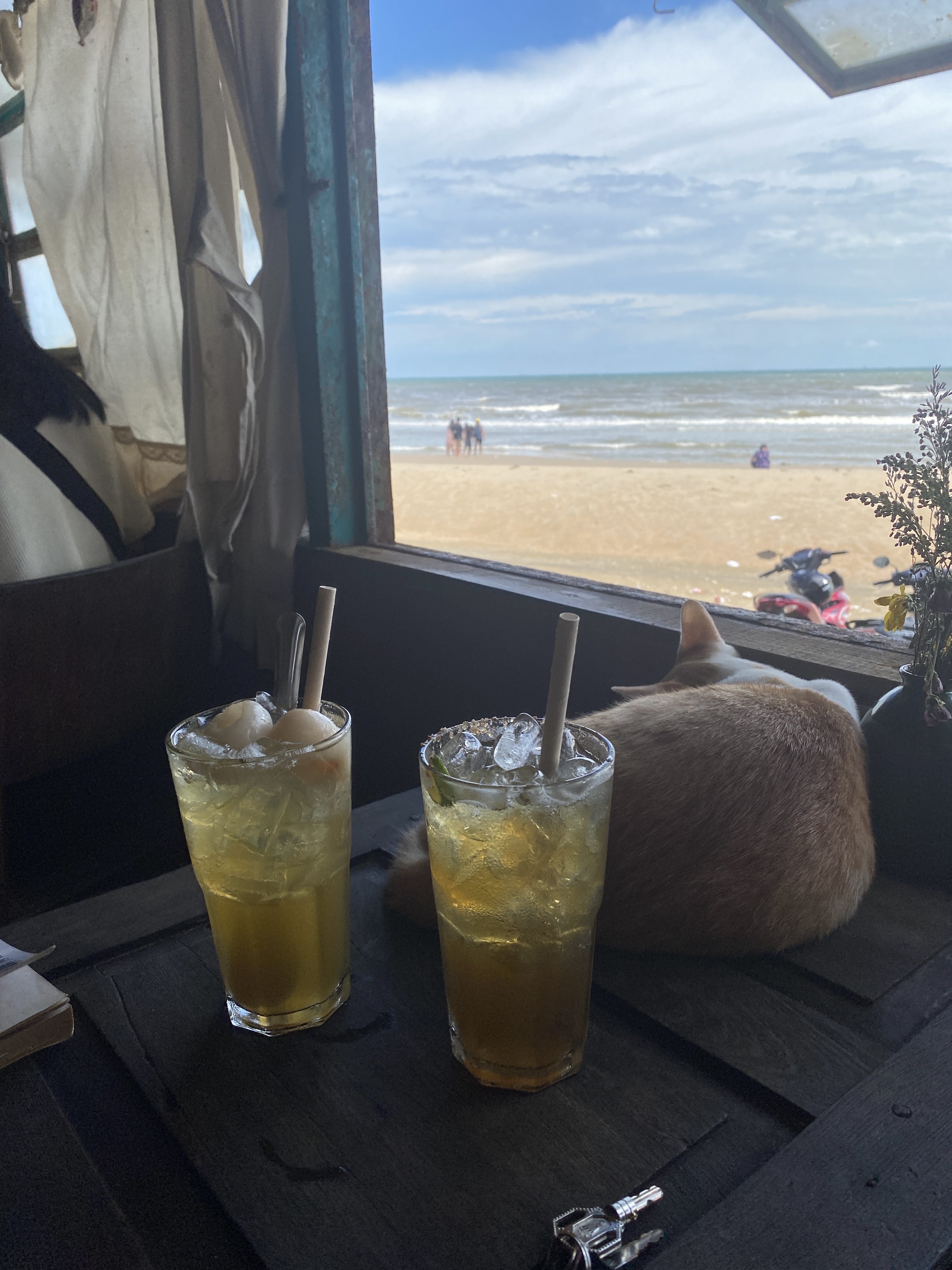 Chúng tôi lái xe đi quán 1991’s beer & coffee. Không gian quán rất là có vibe, gió biển thổi lồng lộng. Ngồi đó chúng tôi được nghe tiếng sóng tiếng gió, được sờ soạng tay vịn đang ngủ trưa đê mê, được nhìn mưa bay từ Vũng Tàu qua Long Hải và lần đầu nhìn mưa rầm rầm cạnh biển.