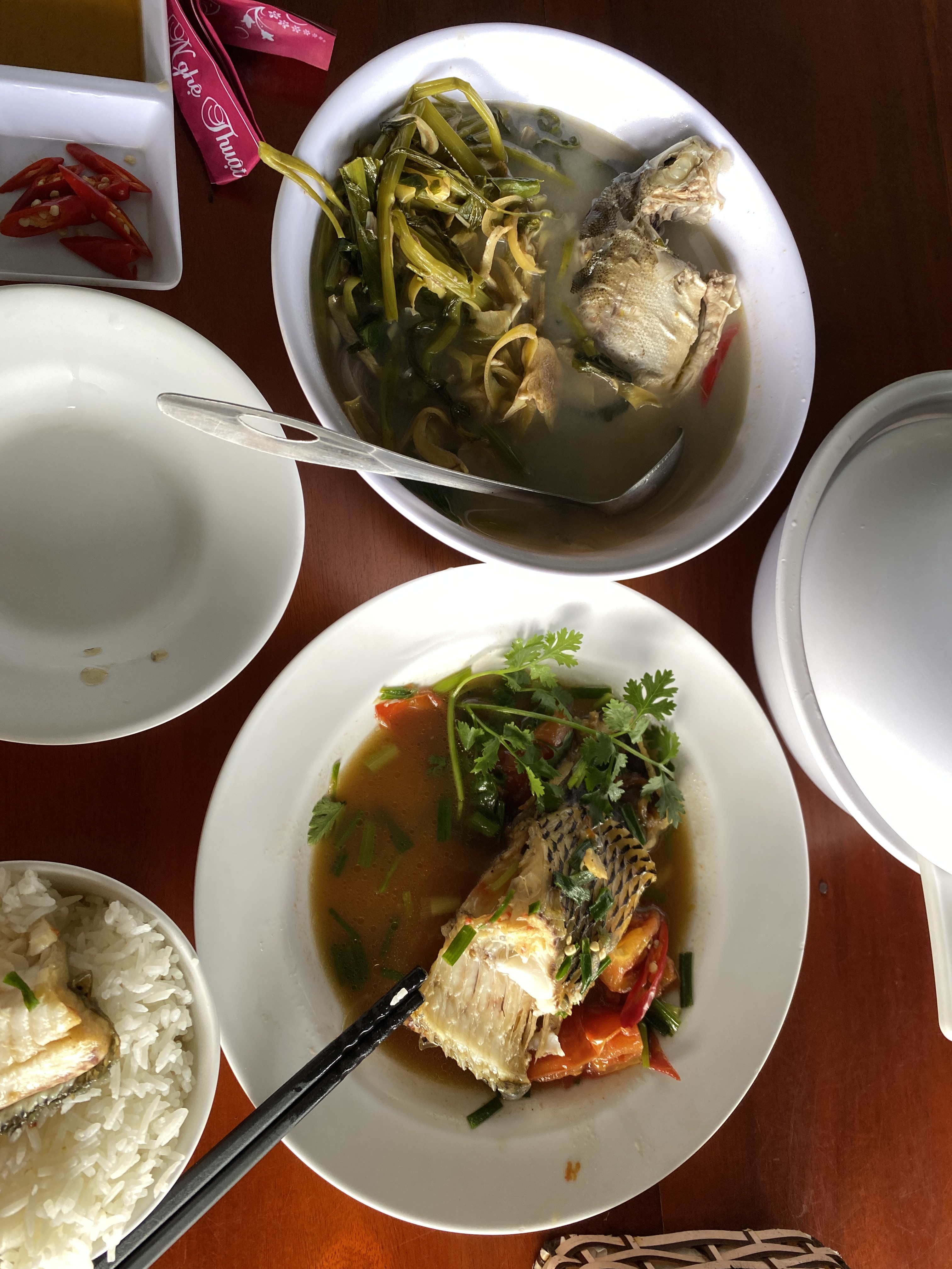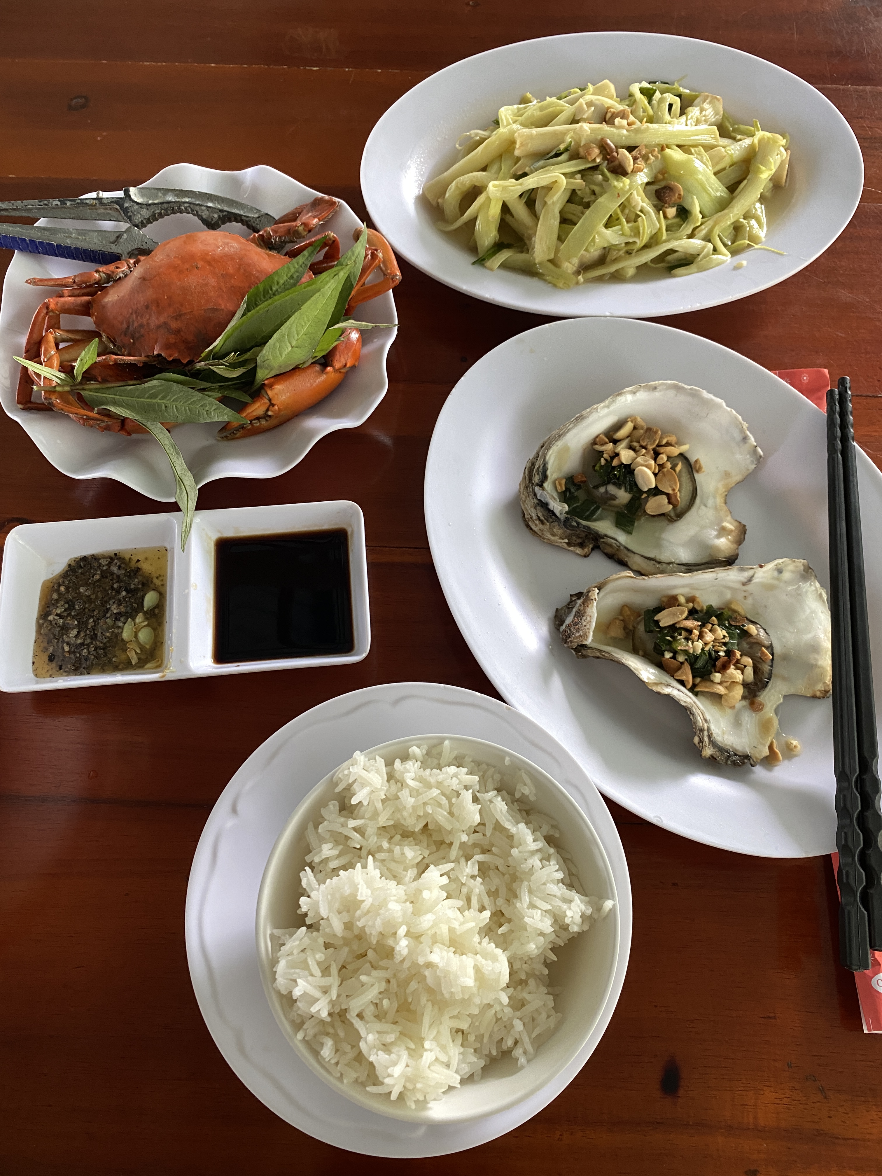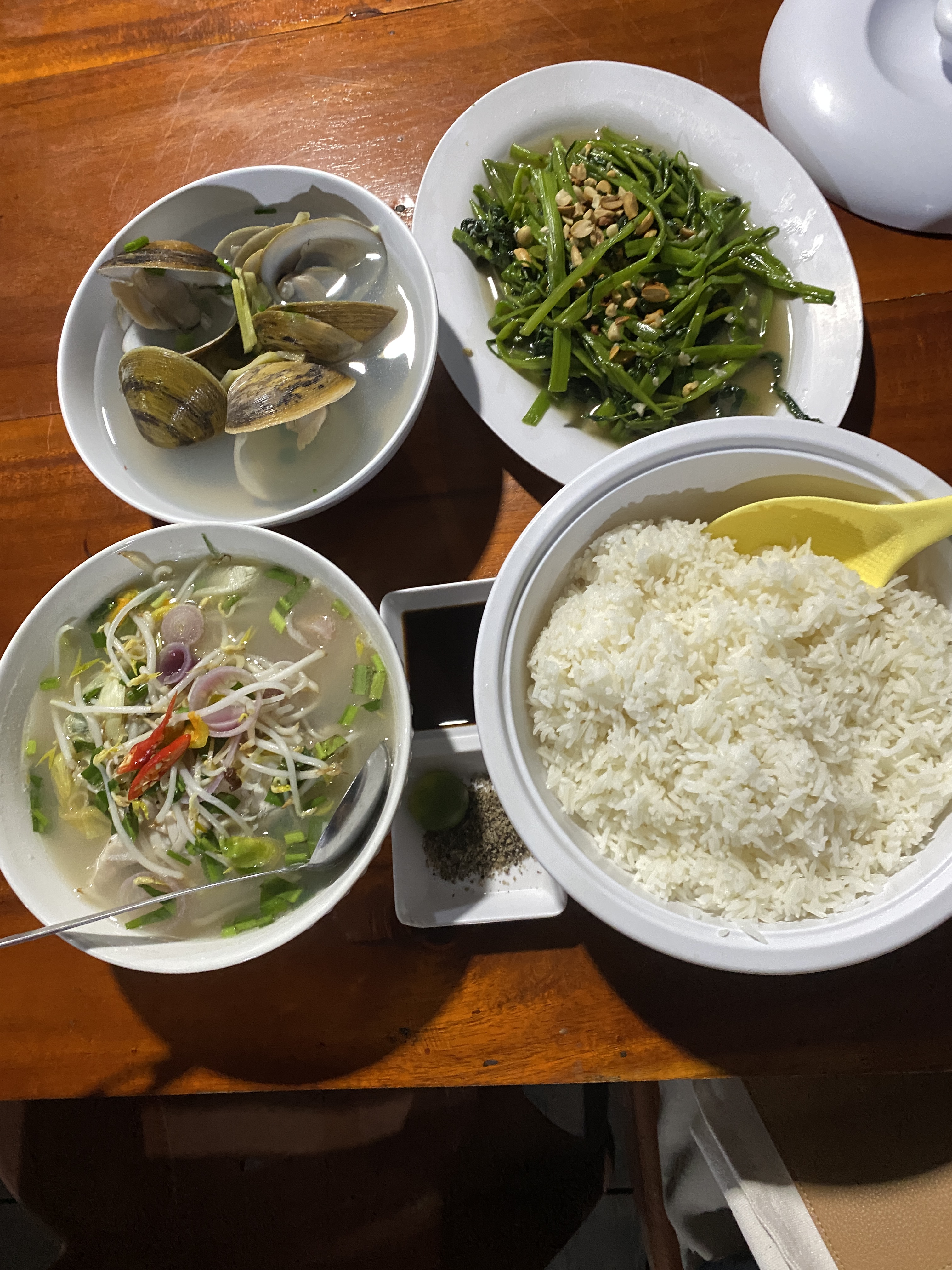 Bữa ăn của mình chủ yếu là thuỷ sản mà chủ nhà bắt ngay gần nhà. Trước giờ ăn, mình sẽ báo là mình muốn ăn gì và họ đi bắt về, nấu cho mình ăn. Mình được thử qua nhiều món mới lạ như vọp, cá gì đó =)), cua,… Món ăn không hợp khẩu vị mình lắm, được cái không bị ngọt và mặn, lại rất tươi. Buồn duy nhất là mình ăn một mình nên phải cố ăn hết, no bể bụng, và mình còn không biết ăn cua, vứt nhiều mà không hề biết nữa. ;-;