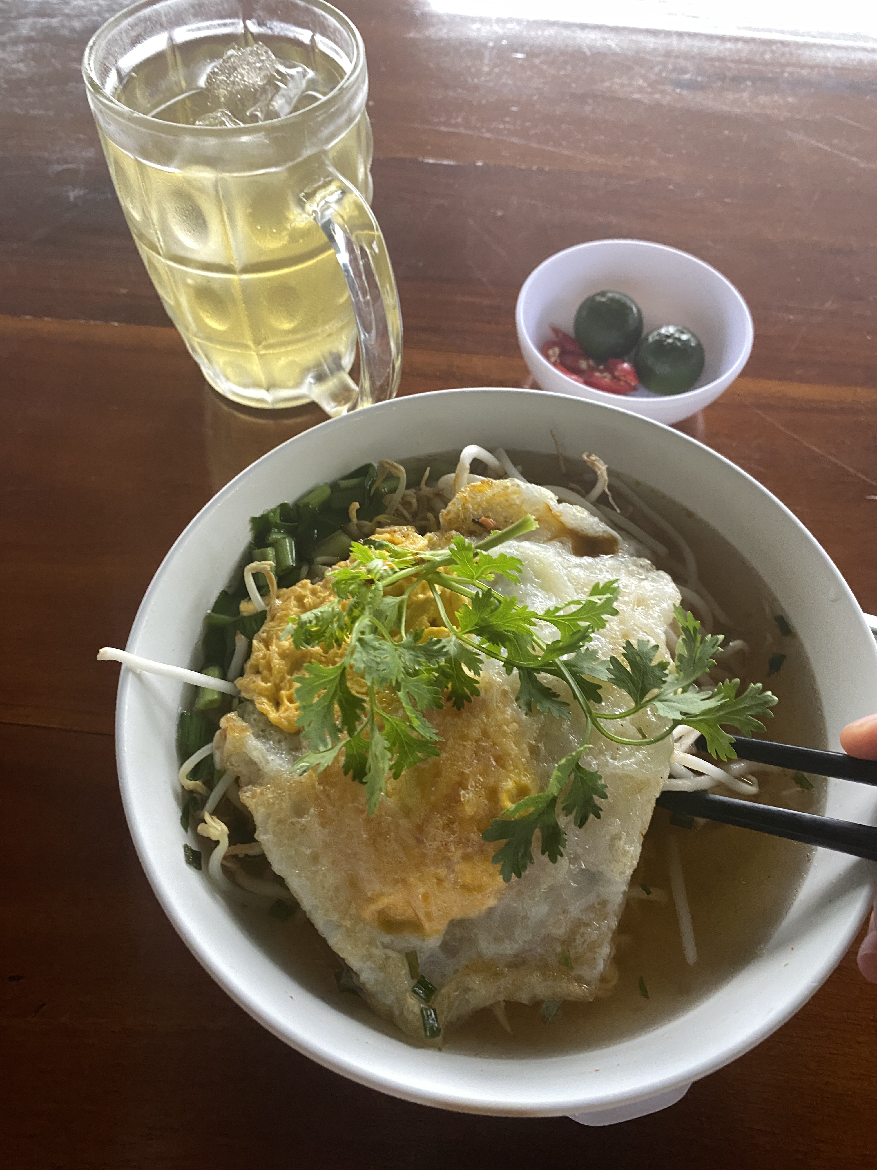 Xe đến BX Nam Căn lúc chưa đầy 6 giờ sáng. Mình vừa xuống xe thì bị các cô các chú kéo vào quán nước để ngồi đợi xe trung chuyển. Và kéo vào quán nước thì phải gọi nước, mua bánh, nói chung là mình bị upsell liên tục. Thì mình đã mua một cái bánh bông lan 30k, chiếc bánh được làm từ 1kg đường, đến mức lúc nhai mình còn nghe tiếng lạo xạo của đường. @@