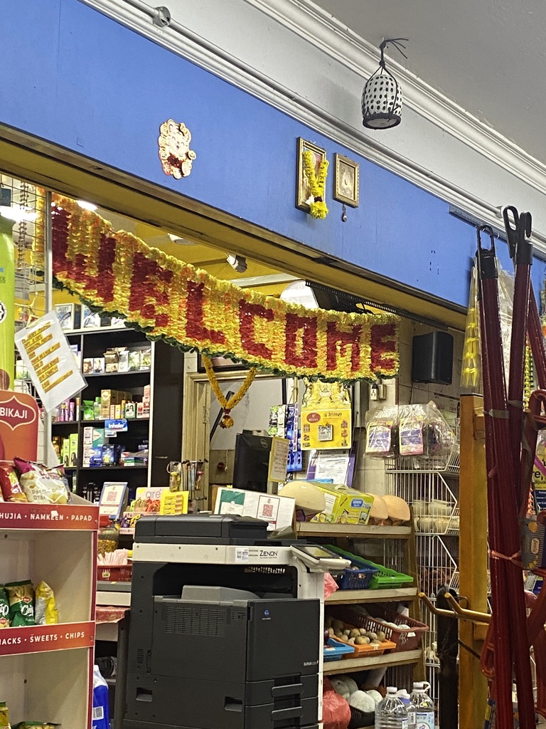 Đối diện homestay mình ở là một siêu thị mini bán đồ Ấn Độ. Mình thấy cái siêu thị này dễ thương, có chữ Welcome bằng hoa tết trước cửa nên mình vào ngó thử xem có gì hay ho. Mình thích đi siêu thị lúc đi chơi lắm, không hỉu sao haha.