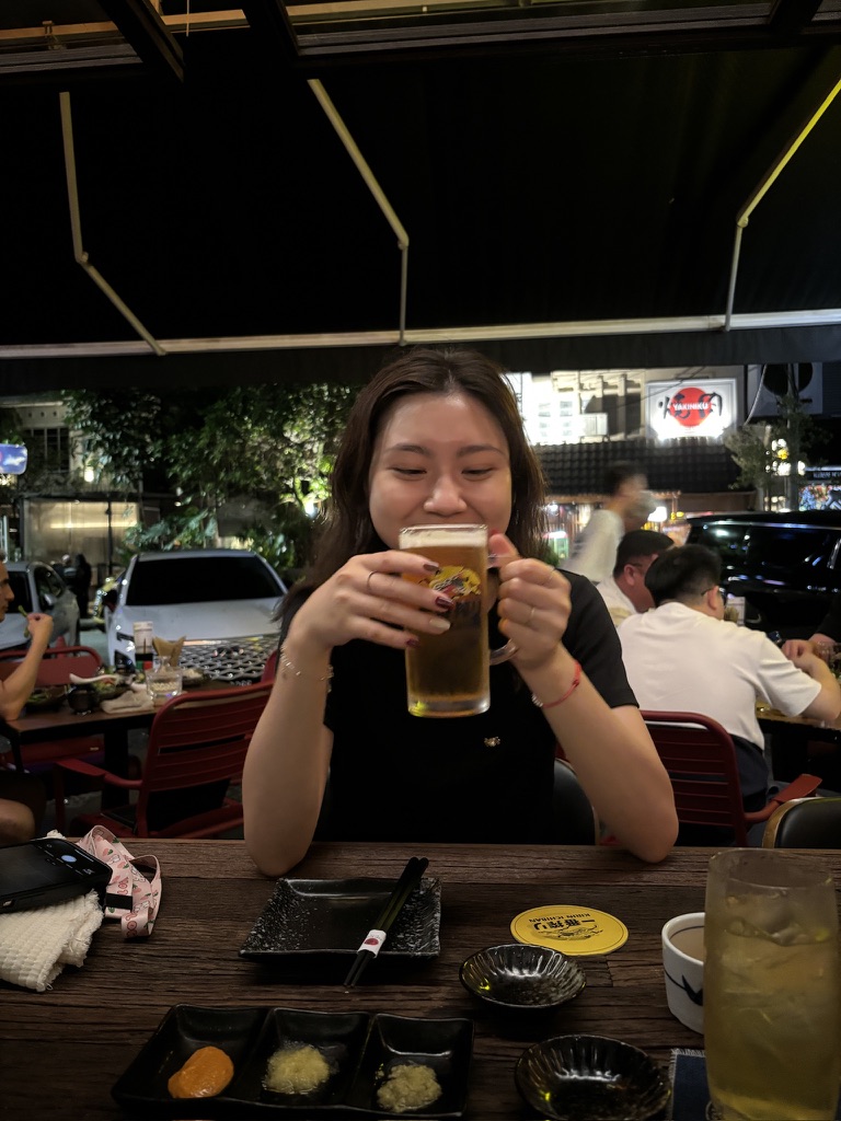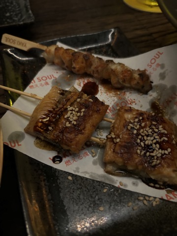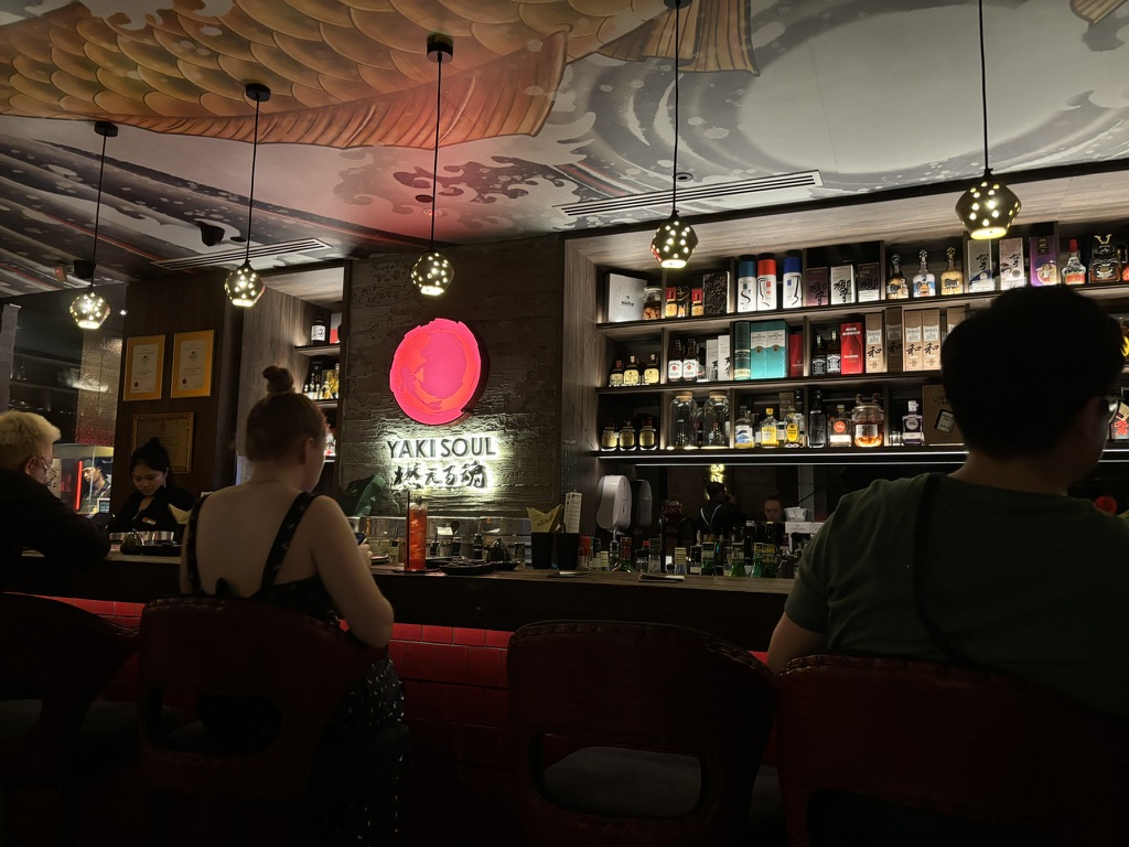 Hôm sau, tụi mình đi nhậu một quán izakaya cũng gần chỗ ở, nơi có không gian, nhạc và cách phục vụ rất cởi mở, rất giống quán Reika Izakaya mình từng đi ở Quận 1, chỉ là quán này giá đắt hơn. :v Lúc đó còn khá nhiều tiền mặt nên tụi mình bảo tiêu hết tiền cũng được, bởi vì triết lý chuyến đi là “nghèo mà có kỷ niệm”. 🥳