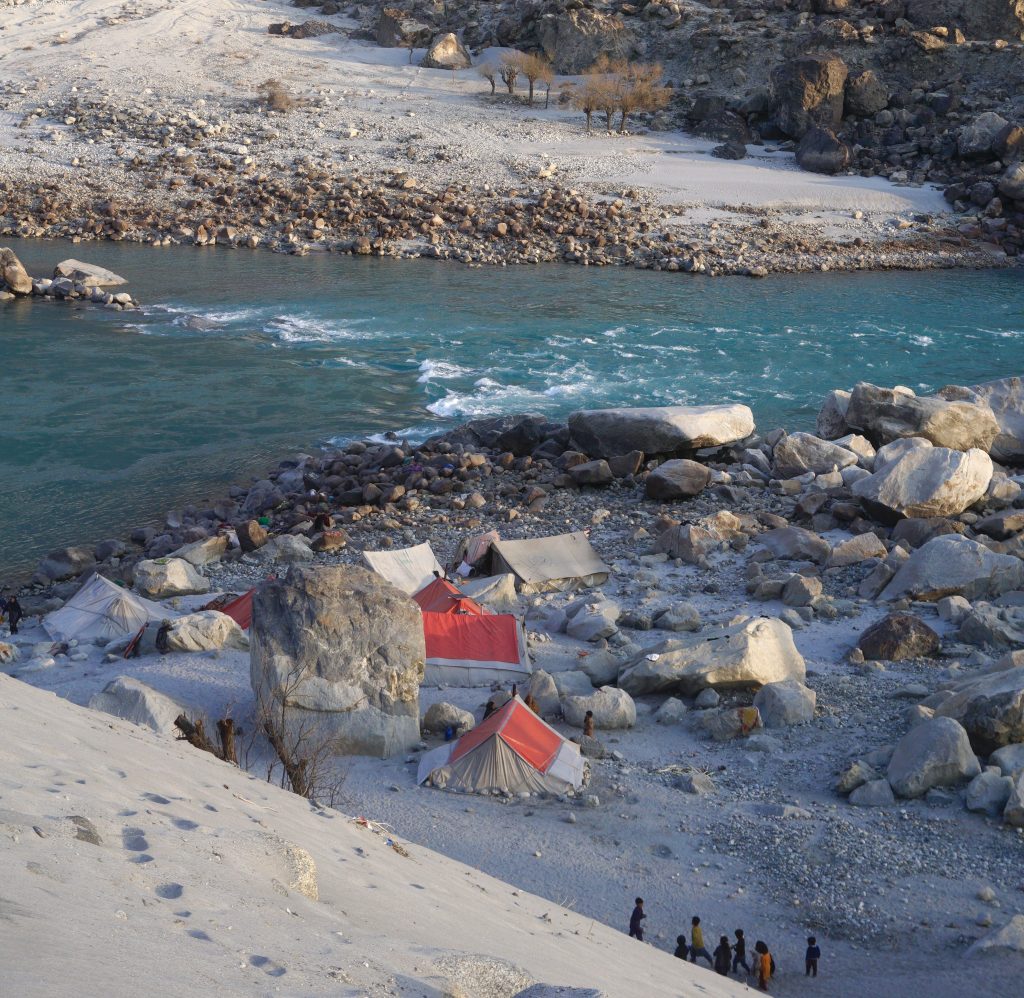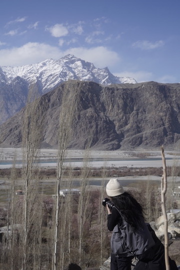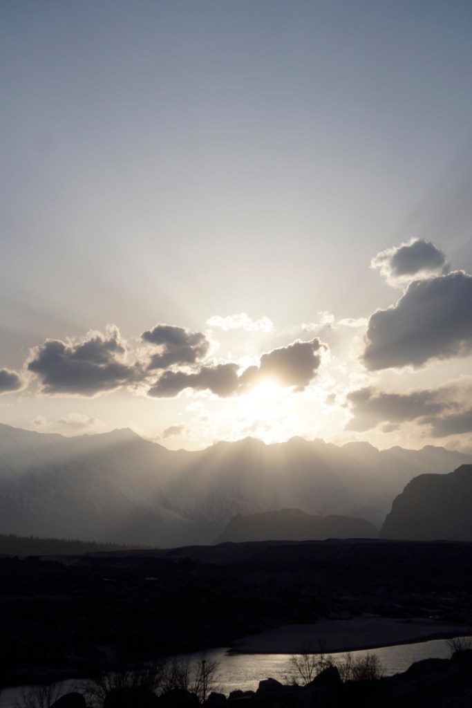 Rời Shigar Fort quay lại con đường cũ, nhóm mình được thả xuống một chỗ viewpoint ngắm hoàng hôn với khung cảnh sông Indus xanh ngọc bích, lấp lánh những vệt sáng phản chiếu tia nắng. Đằng sau mình là sa mạc, là những dãy núi tuyết. Trong không khí mát lạnh và trong lành ấy, mình dường như quên đi tất cả mọi thứ trên đời. Chỉ có mình với mặt trời và những dãy núi.