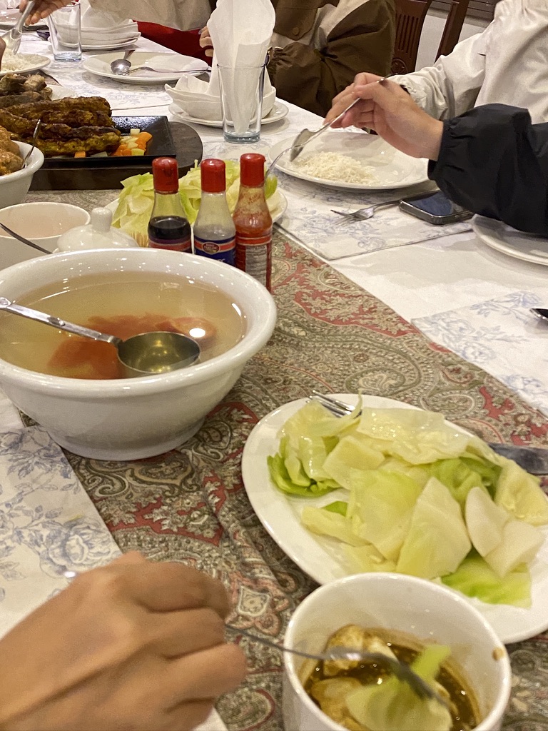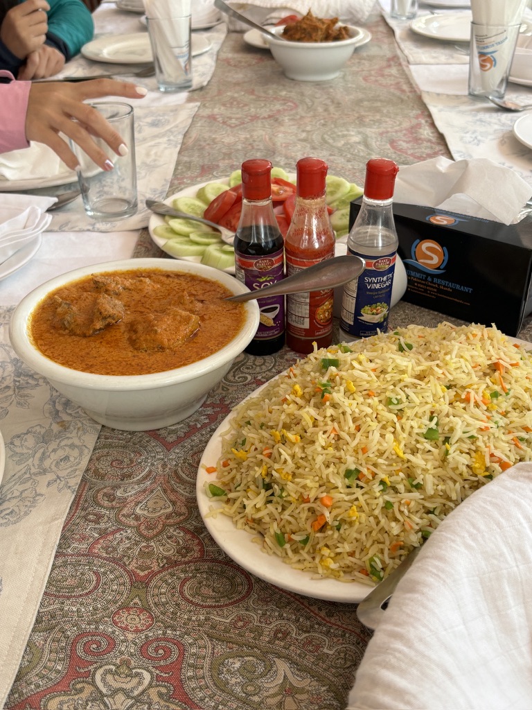 Dù là ngày gần cuối lễ Ramadan nhưng khách sạn vẫn phục vụ bữa ăn trưa cho du khách. Thực đơn không đa dạng lắm, nhưng các món ăn cũng dễ nuốt, có lẽ vì đi chơi quá vất vả nên cái mỏ mình trở nên dễ tính. Vì là đất nước đạo Hồi nên bàn ăn chỉ có thịt gà, thịt cừu, cá, bánh chapati, rau cải bắp luộc và cơm rang. Hạt cơm của họ cũng dài như hạt cơm Ấn Độ dzị.